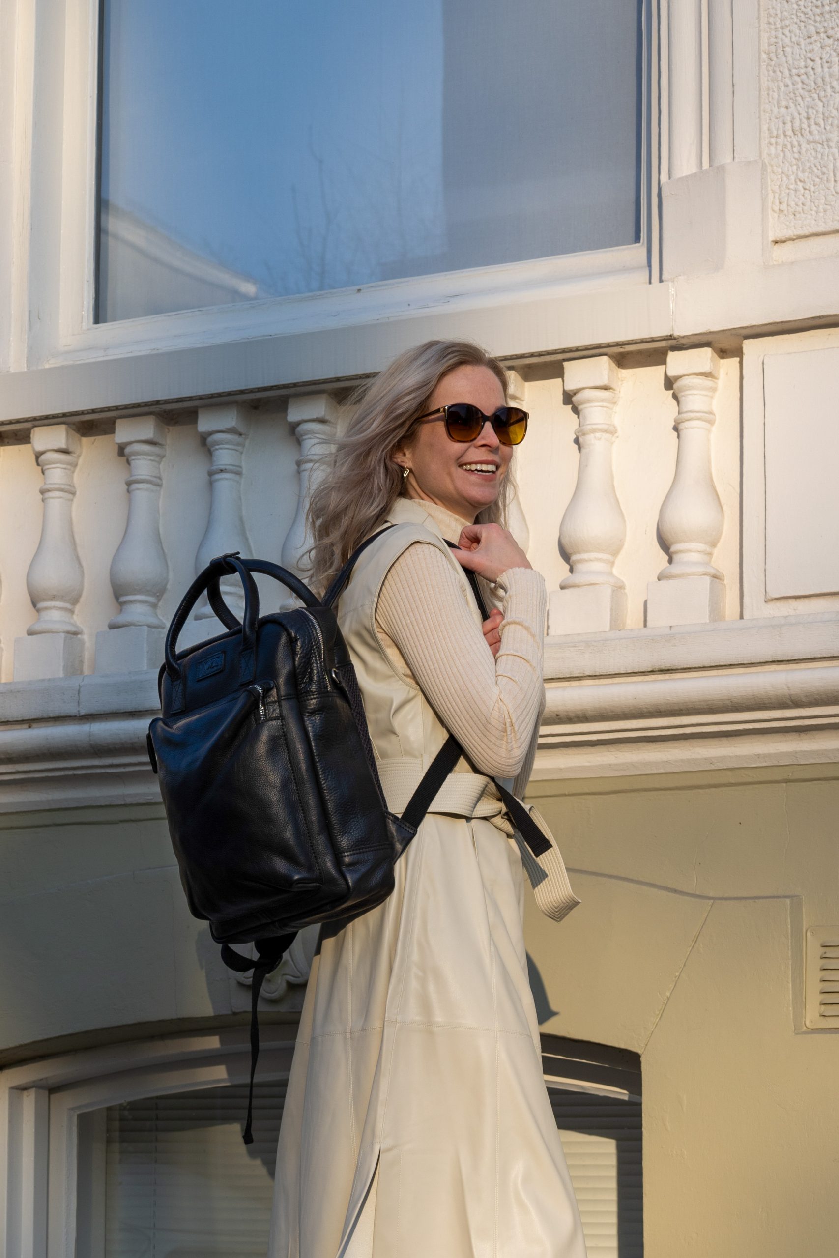 Trendiger schwarzer Leder-Wickeltaschen-Rucksack aus hochwertigem, vollnarbigem Raider-Rindsleder. Das Design ist zeitlos und das Leder bekommt durch den Gebrauch noch mehr Charakter. Auch Väter können mit dieser robusten Leder-Wickeltasche sicher ein Statement setzen. Die Möglichkeit, einen Wickelrucksack auf dem Rücken zu tragen, gibt Ihnen mehr Freiheit beim Gehen mit Ihrem Baby. Sie haben immer zwei Hände frei, so dass Sie zum Beispiel das Kleine auf dem Arm tragen können, ohne sich mit einer Tasche herumärgern zu müssen, die herunterfällt oder im Weg ist. Ein schöner Bonus dieses Lederrucksacks ist, dass Sie ihn, wenn Sie ihn nicht mehr als Windeltasche brauchen, weiterhin als Arbeitstasche verwenden können. Das Fach der Windelmatte ist gepolstert und bietet Platz für einen 15-Zoll-Laptop oder ein Tablet.